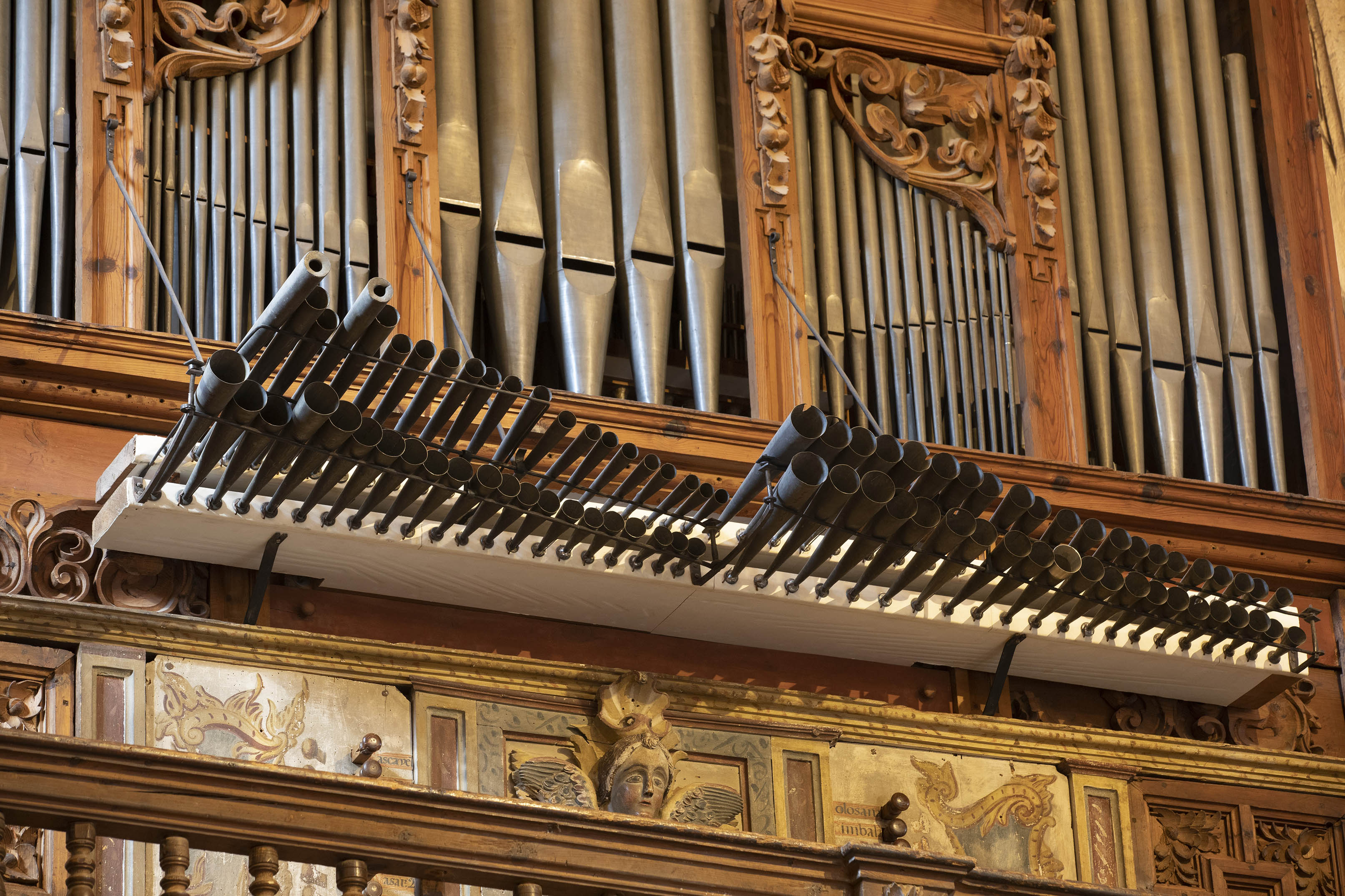 Posee coro de madera con artesonado, barandilla torneada y antepecho con relieves tallados de carácter popular.